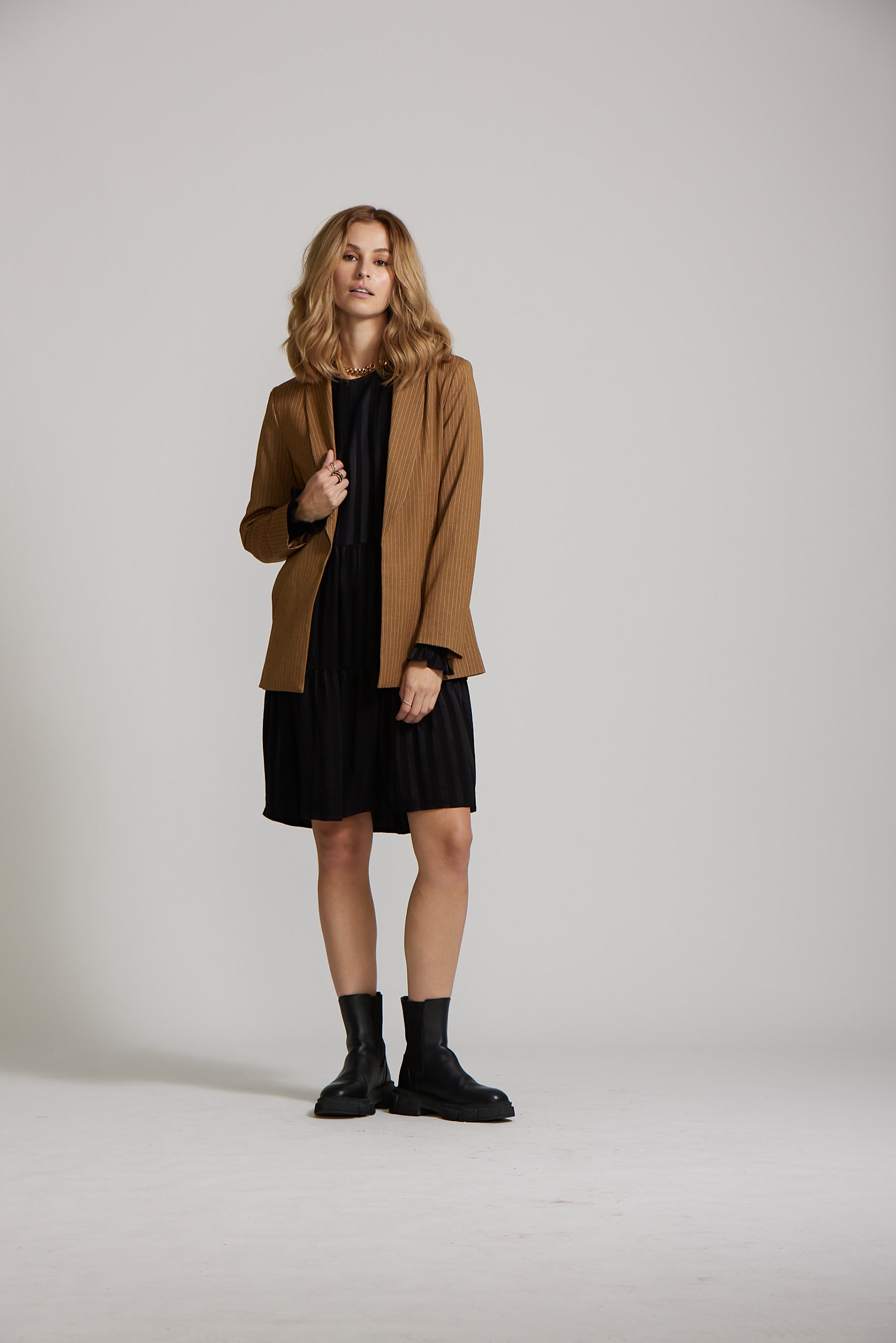 For a funky and smart casual approach during a girls brunch on the weekend, simply pair yours with our Carrie Dress and chunky boots.